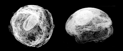 The Silk Pavilion explores the relationship between digital and biological fabrication on product and architectural scales.The primary structure was created of 26 polygonal panels made of silk threads laid down by a CNC (Computer-Numerically Controlled) machine. Inspired by the silkworm’s ability to generate a 3D cocoon out of a single multi-property silk thread (1km in length), the overall geometry of the pavilion was created using an algorithm that assigns a single continuous thread across patches providing various degrees of density. Overall density variation was informed by the silkworm itself deployed as a biological printer in the creation of a secondary structure. A swarm of 6,500 silkworms was positioned at the bottom rim of the scaffold spinning flat non-woven silk patches as they locally reinforced the gaps across CNC-deposited silk fibers. Following their pupation stage the silkworms were removed. Resulting moths can produce 1.5 million eggs with the potential of constructing up to 250 additional pavilions. Affected by spatial and environmental conditions including geometrical density as well as variation in natural light and heat, the silkworms were found to migrate to darker and denser areas. Desired light effects informed variations in material organization across the surface area of the structure. A season-specific sun path diagram mapping solar trajectories in space dictated the location, size and density of apertures within the structure in order to lock-in rays of natural light entering the pavilion from South and East elevations. The central oculus is located against the East elevation and may be used as a sun-clock. Parallel basic research explored the use of silkworms as entities that can “compute” material organization based on external performance criteria. Specifically, we explored the formation of non-woven fiber structures generated by the silkworms as a computational schema for determining shape and material optimization of fiber-based surface structures.